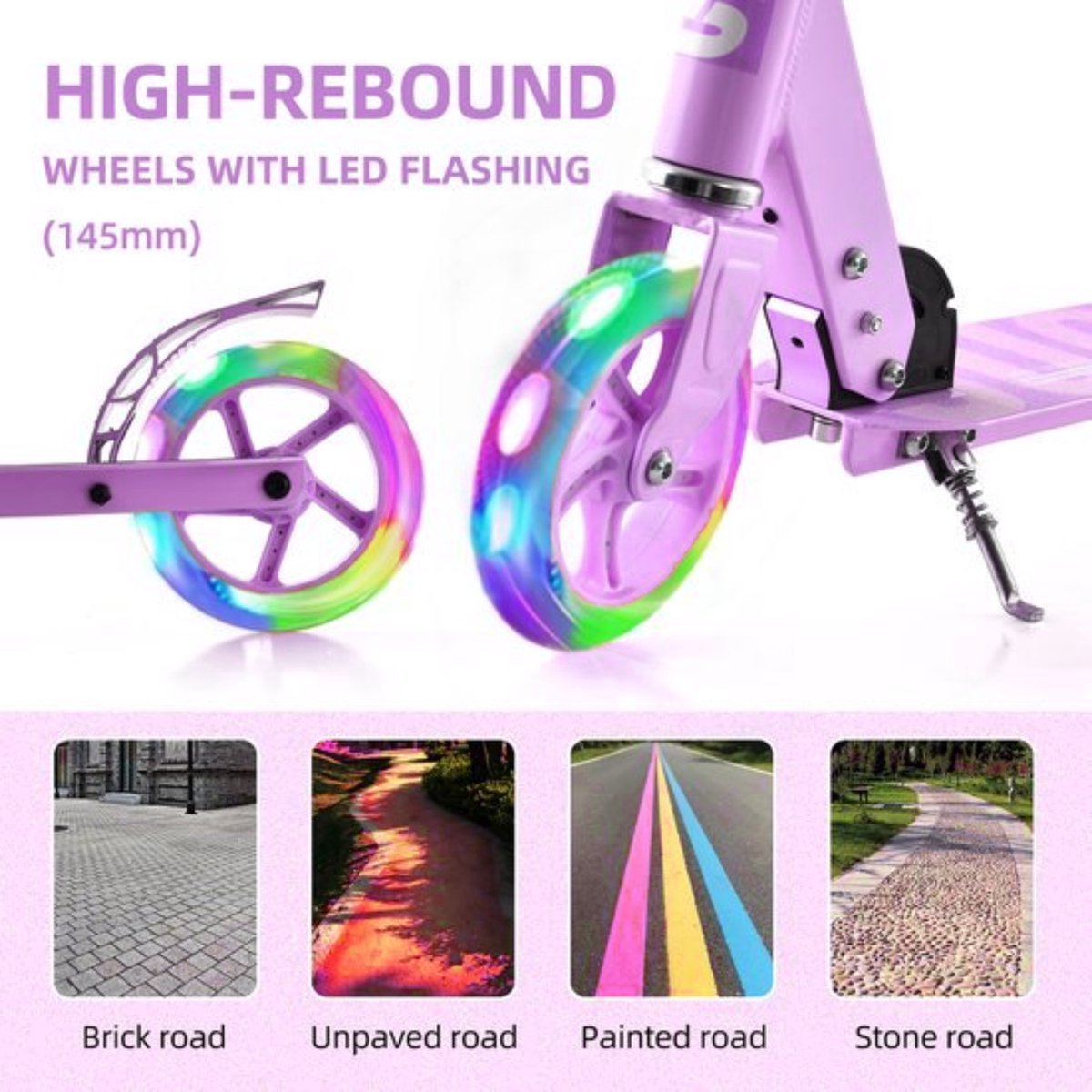 LED-oplichtende wielen – De twee 145 mm PU-wielen lichten vanzelf op bij beweging, zonder batterijen. Hoe sneller je rijdt, hoe feller ze schijnen