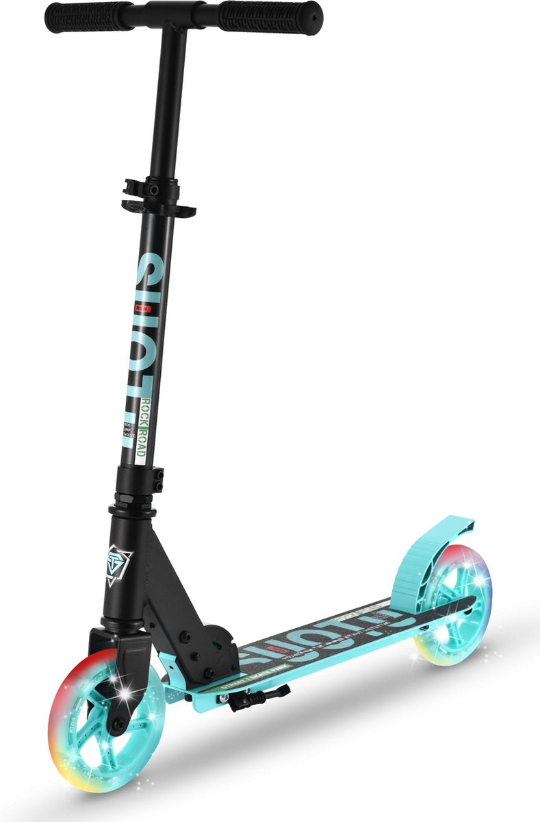 LED-oplichtende wielen – De twee 145 mm PU-wielen lichten vanzelf op bij beweging, zonder batterijen. Hoe sneller je rijdt, hoe feller ze schijnen