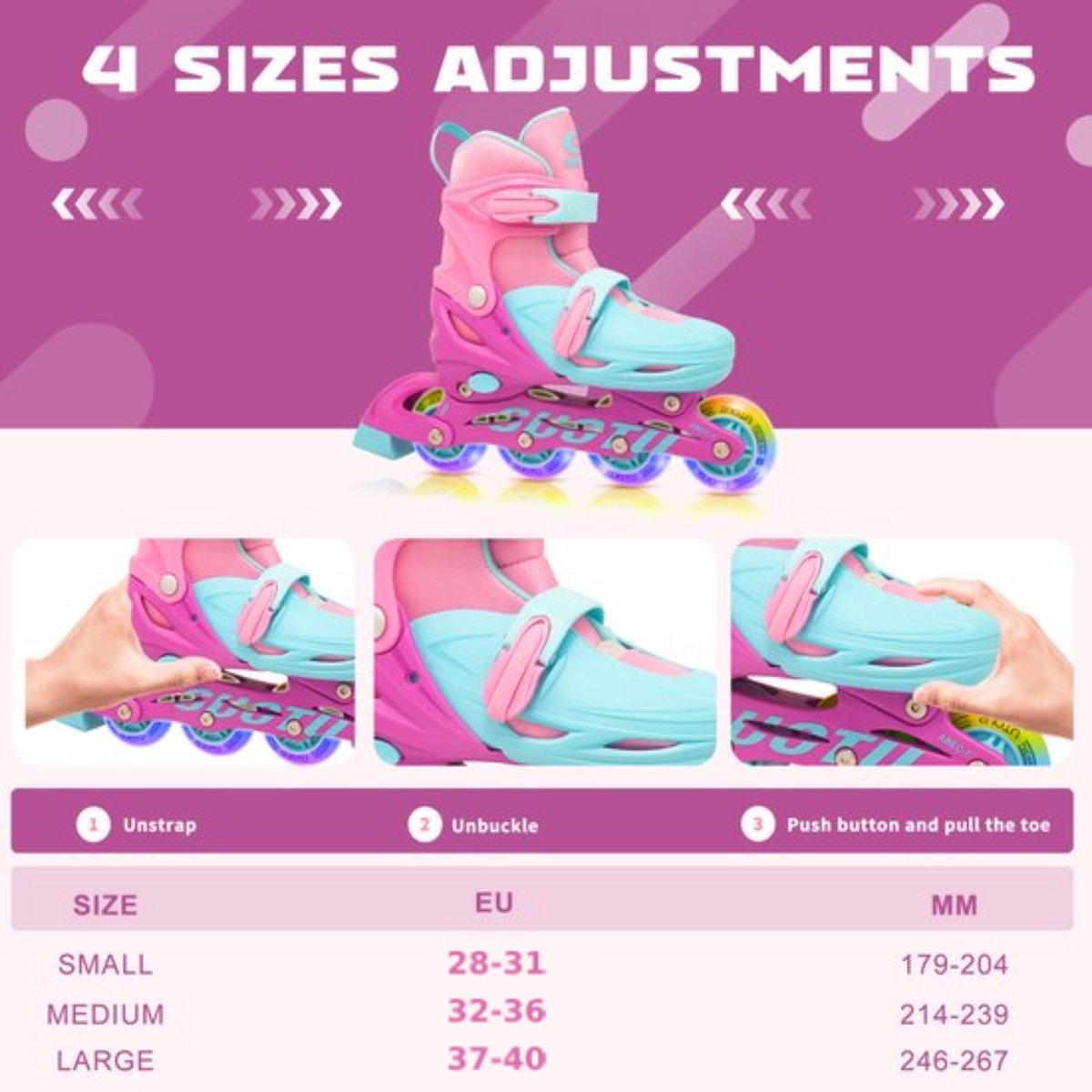 Je hoeft je geen zorgen te maken dat je kind er te snel uitgroeit – deze skeelers zijn eenvoudig in 4 maten te verstellen met één druk op de knop. Bekijk vooraf de maattabel en stel de perfecte pasvorm in met een simpele klik.